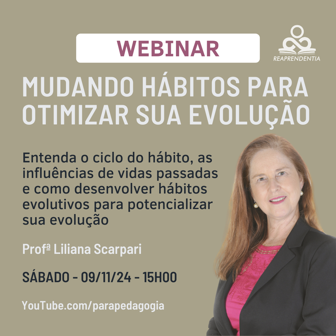 | FreeWebinar “Mudando hábitos para otimizar sua evolução”: A professora Liliana Scarpari aborda o ciclo do hábito, as influências de vidas passadas e como desenvolver hábitos evolutivos para potencializar sua evolução.
